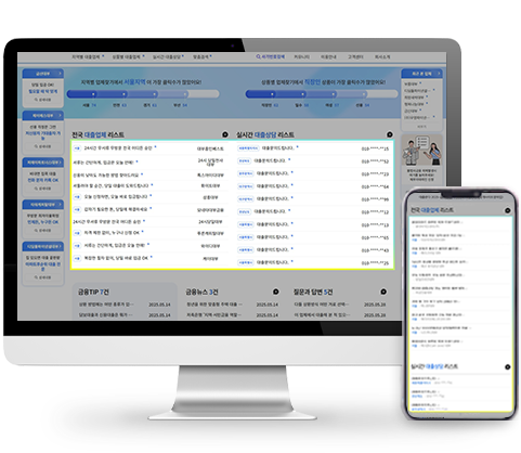 홈페이지 메인화면 최상단, 지역·상품별업체검색 좌측상단, 실시간대출문의 좌측하단